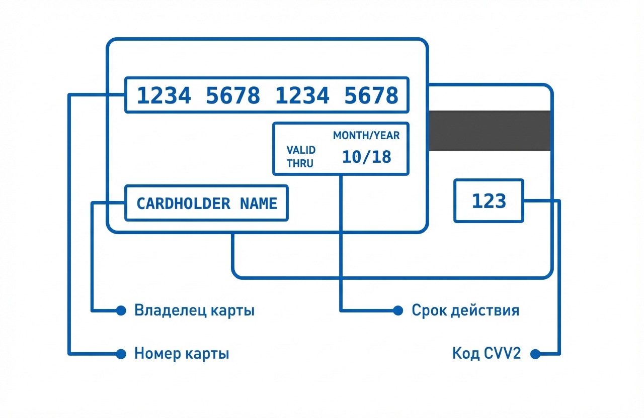 2.2. Entering card details. On the payment page, you need to enter your bank card details in the corresponding fields: - Card number (16 digits on the front side); - Card expiration date (month and year); - Cardholder's first and last name (in Latin letters, as indicated on the card); - CVV2 / CVC2 code (three digits located on the back of the card on the signature strip).